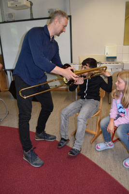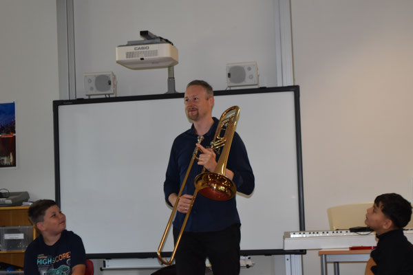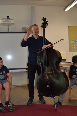 Hautnah Musikinstrumente erleben durften die Schüler und Schülerinnen der Klassen 3a und 3b. Herr Fuchs hatte diese Woche seine Posaune und einen 120 Jahre alten Kontrabass