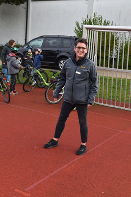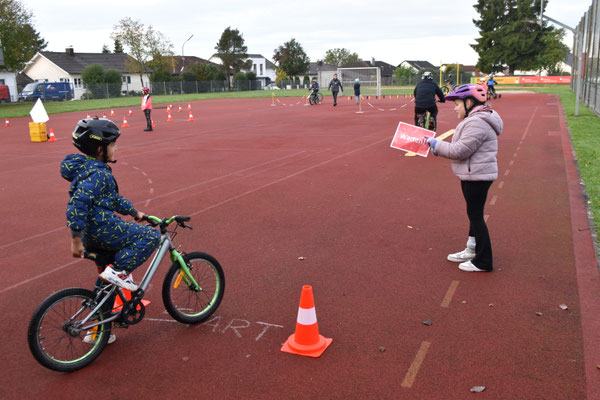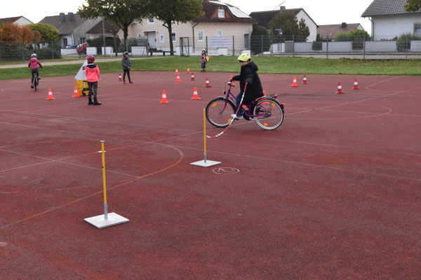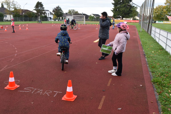 vorgesteckten Bahnen zu fahren. Was am Anfang nicht fehlerfrei gelang, wurde mit jeder Runde besser. Die Kinder gewannen bald Sicherheit auf ihrem Rad und meisterten die Runden mit Bravour! Am
