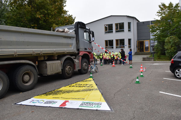 Auf dem Schulhof waren Bereiche rund um den Lkw abgesteckt, die der Fahrer trotz Spiegel und moderner Technik nicht einsehen kann – ein eindrucksvolles Beispiel dafür, warum Fußgänger