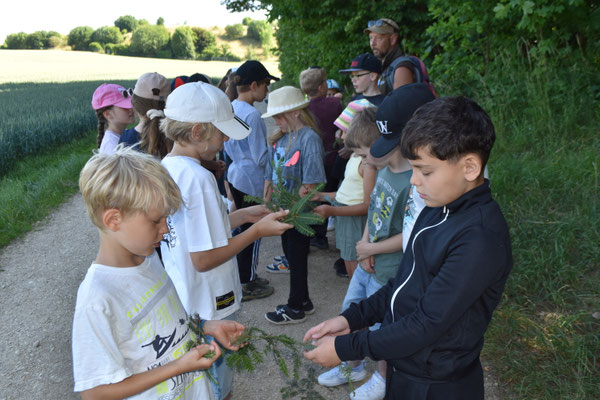 an den Rand des Schulwaldes pflanzen. Unter fachkundiger Anleitung setzten die Kinder den Speierling in das vorbereitete Loch, schaufelten mit Erde zu und traten den Baum fest. Herr Ostermaier