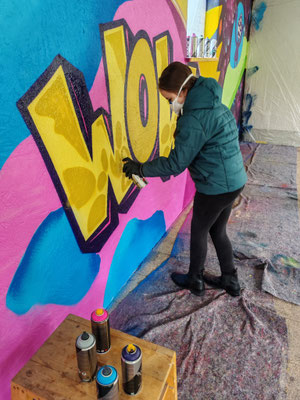 Unter Anleitung des Künstlers Florian Knieling entstand im Ruhepausenhof eine Graffiti-Wand aus Entwürfen unserer Viertklässler. Zuvor waren alle über die verschiedenen Ausprägungen