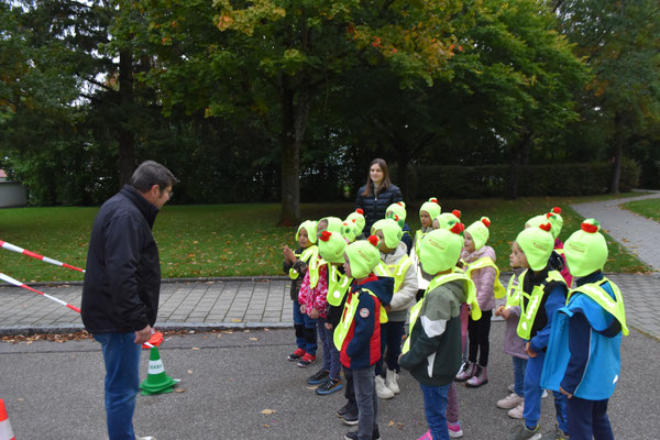 Neumayer, Stephanie Stark und Alicia Eckert leuchtend gelbe Sicherheitsumhänge und signalrote Mützen der Kreisverkehrswacht Eichstätt. Damit sollen die Kinder im Straßenverkehr schon
