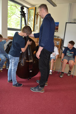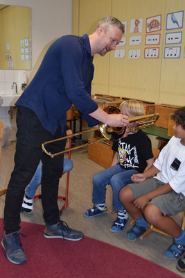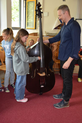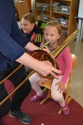 mitgebracht. Es war aufregend und spannend zugleich, als jedes Kind selbst in die Posaune blasen und an dem großen Kontrabass zupfen konnte.
